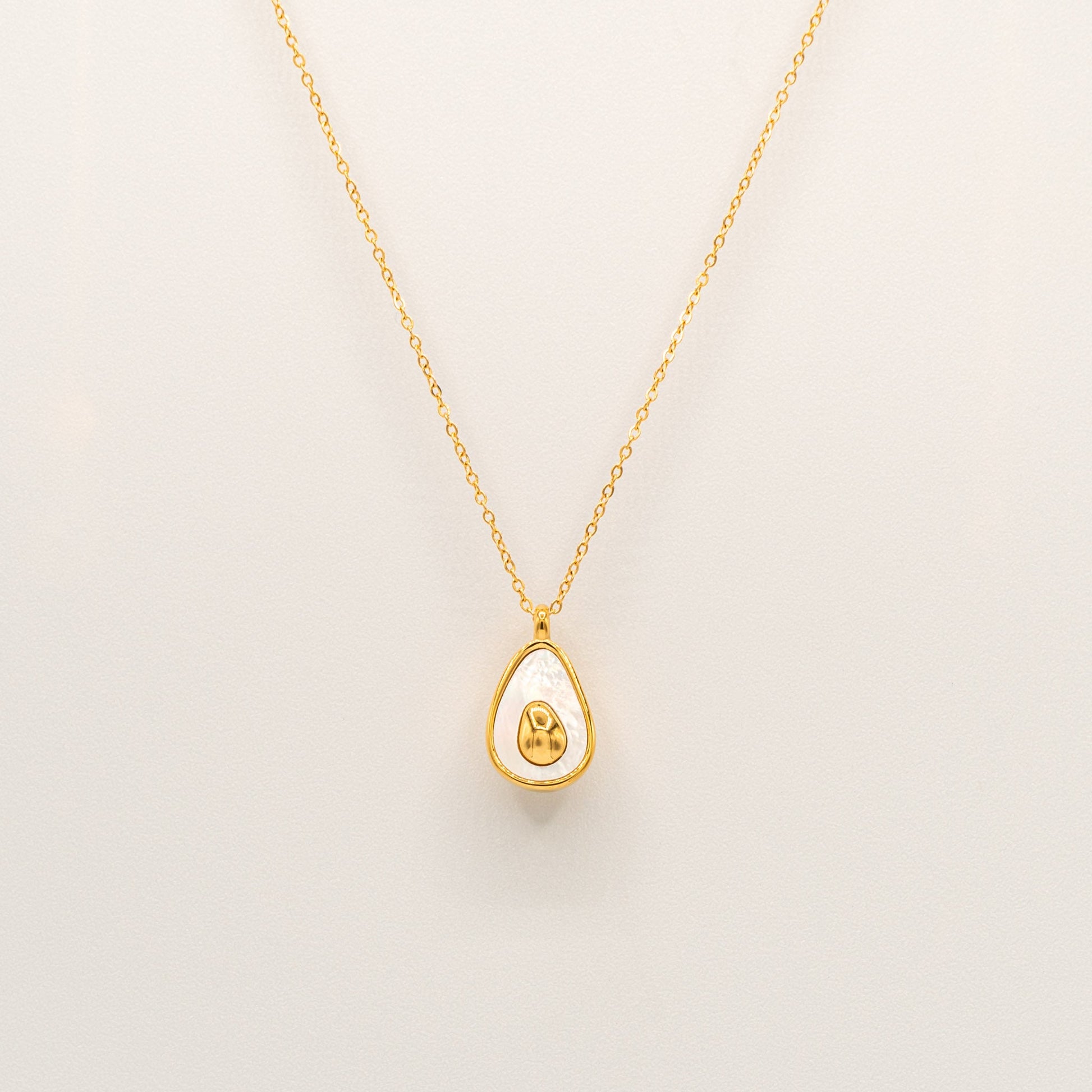 A whimsical yet elegant pendant featuring a mother-of-pearl inlay in a teardrop shape with gold accents. The creamy pearl finish and golden details create a sophisticated play of textures and tones.