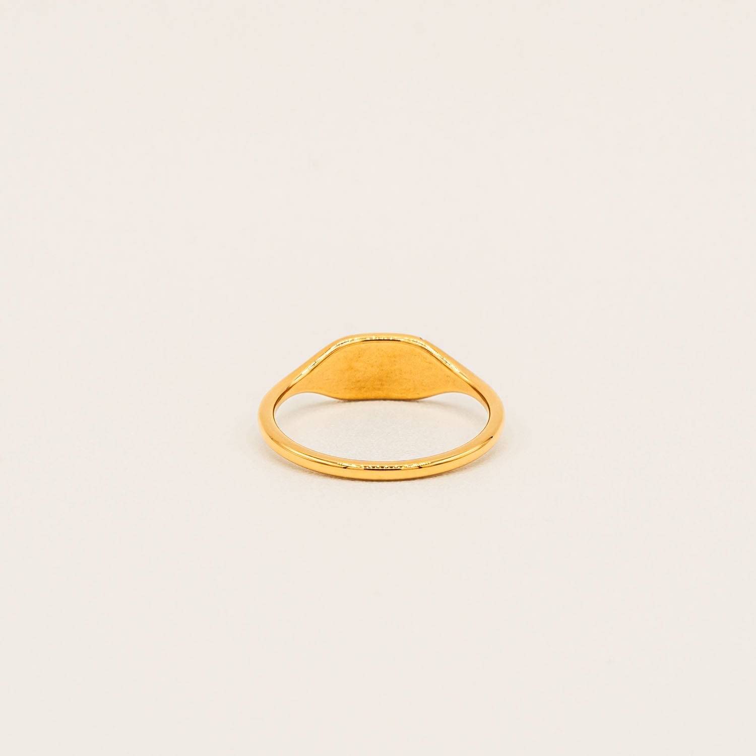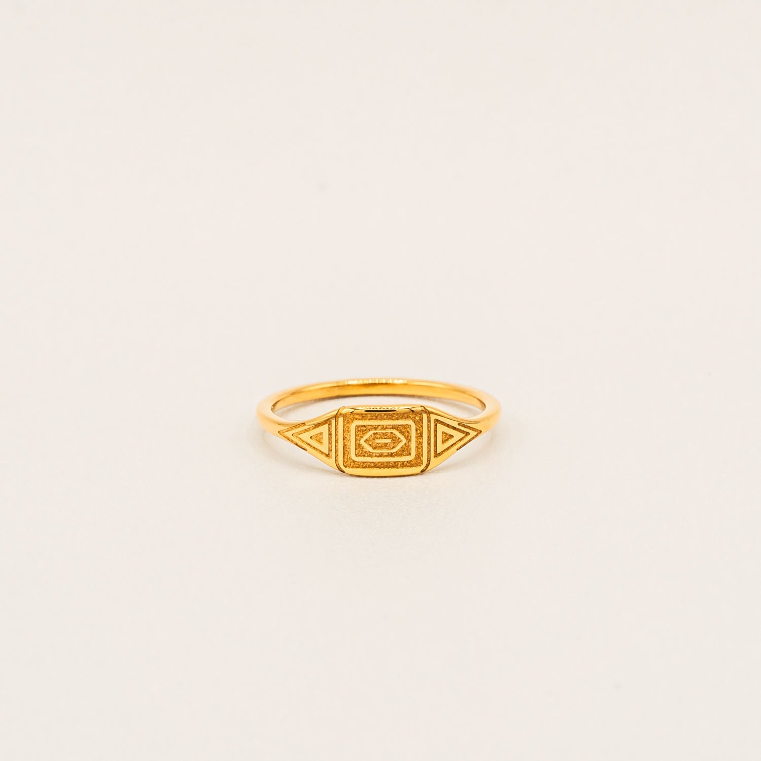 A classic design that is bold enough to stand out. Crafted gold ring with a subtle bezel surface with tasteful laser engraved geometric pattern.