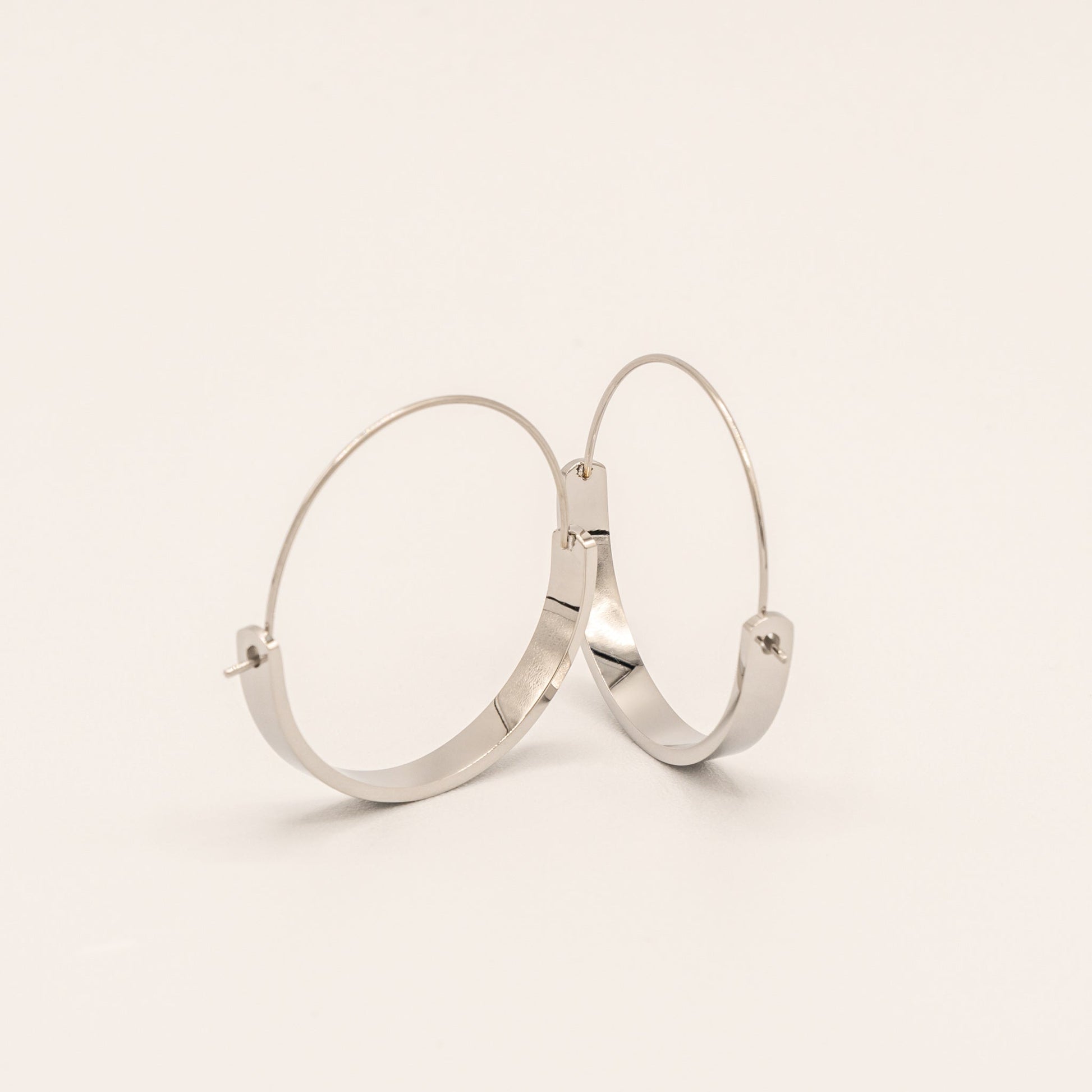 These bold, architectural hoops feature a sleek, flattened profile that creates a contemporary silhouette. The highly polished finish and substantial design make these hoops a modern statement piece.
