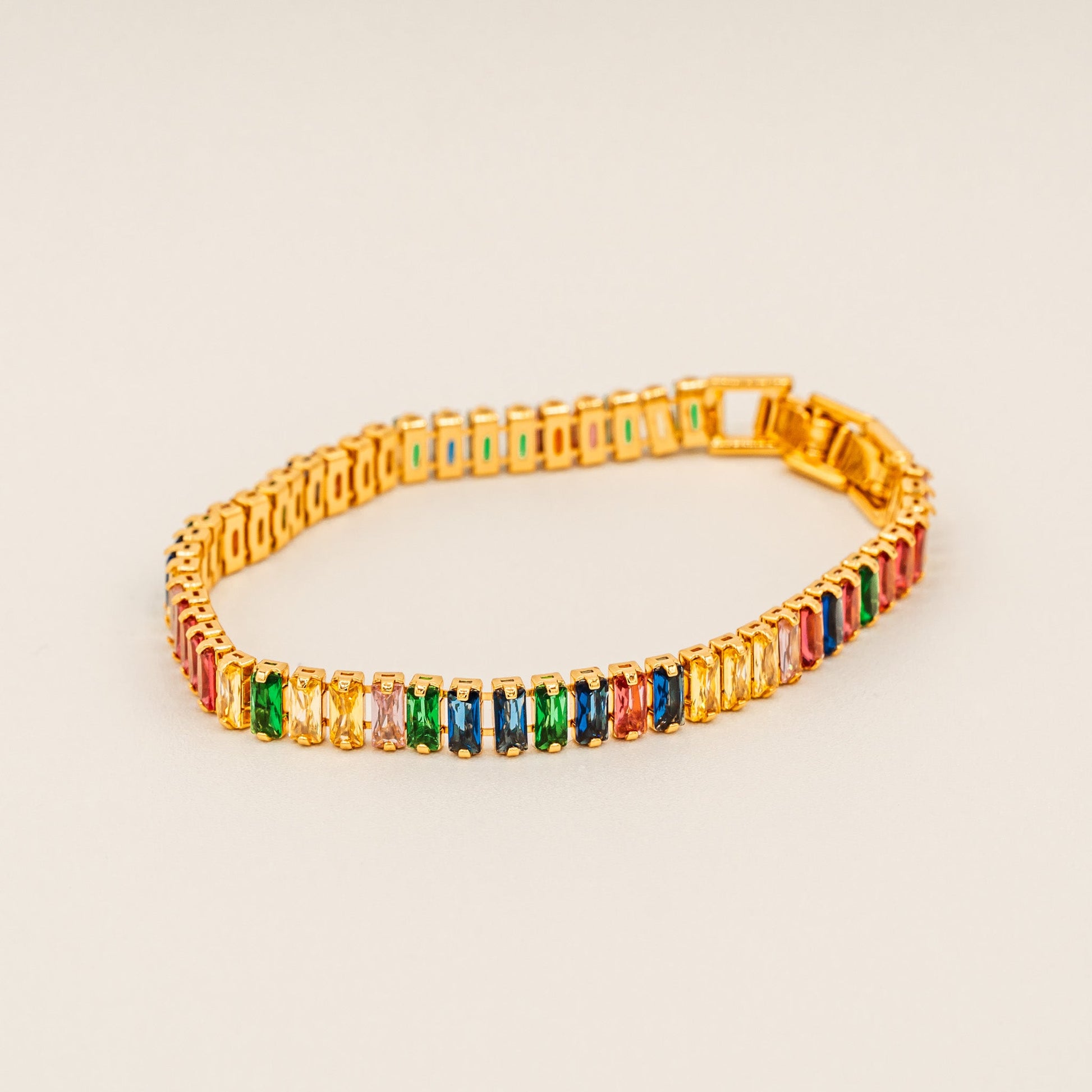 This classic tennis bracelet showcases rectangular-cut cubic zirconia stones set in an architectural gold framework. Each crystal is precisely positioned to maximize brilliance, creating a piece that epitomizes timeless luxury.