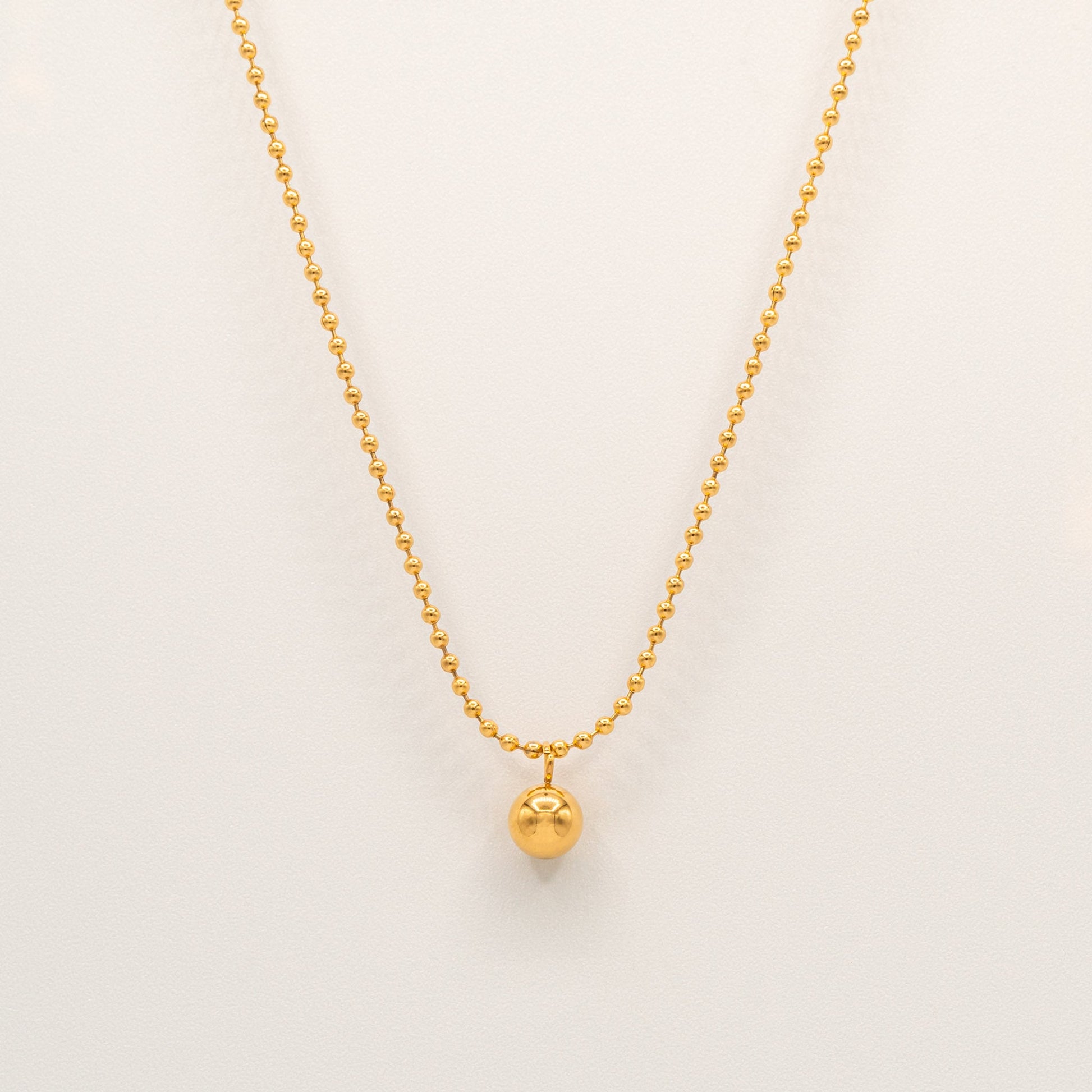 A study in minimalist perfection, this dainty necklace features a perfectly spherical golden charm suspended from a fine ball chain. The simple design creates a luminous focal point that catches light beautifully at the collarbone.