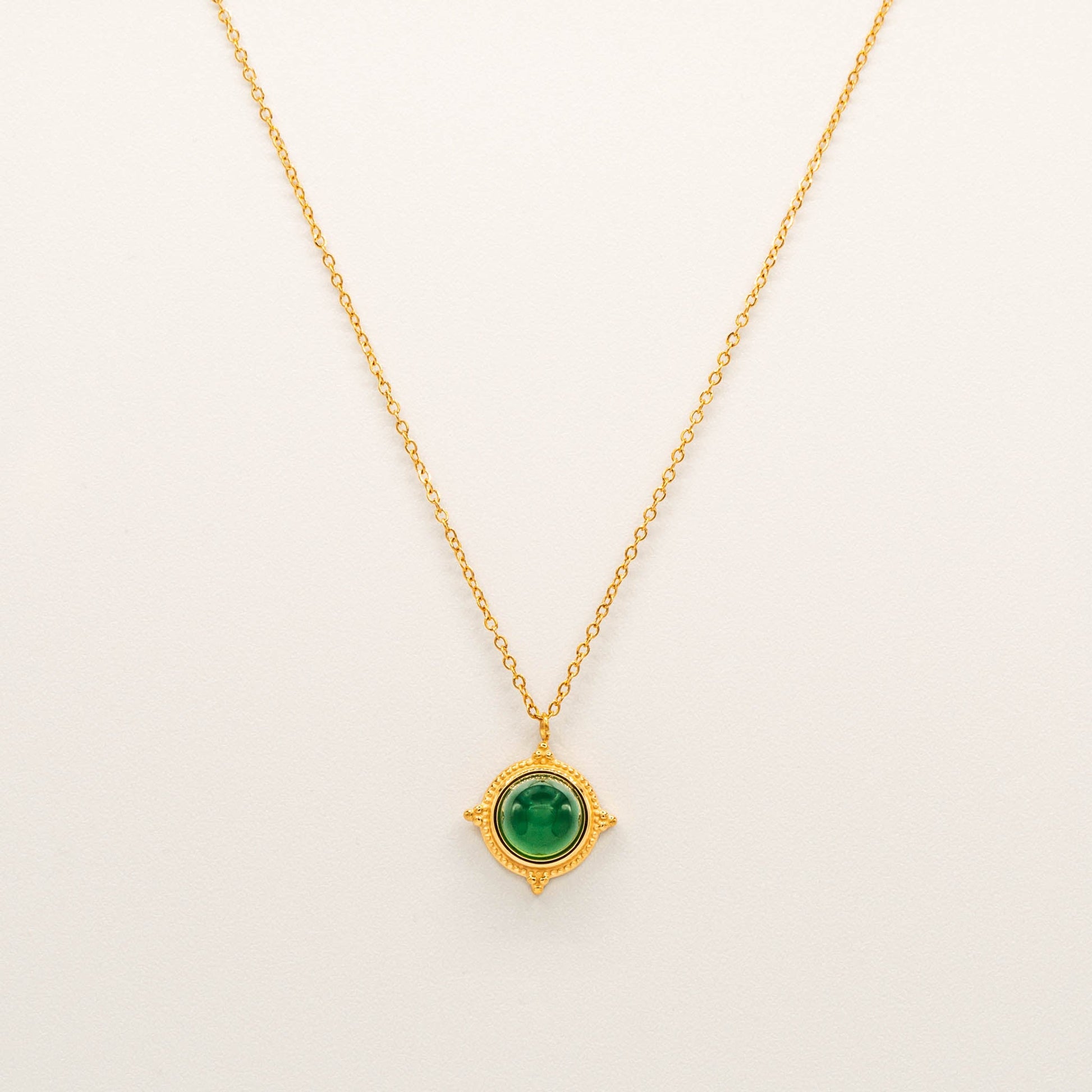 A statement pendant featuring a deep green agate stone nestled within an ornate gold-toned compass-inspired setting. The vintage-inspired design elements frame the stone beautifully, creating a piece that feels both ancient and modern.