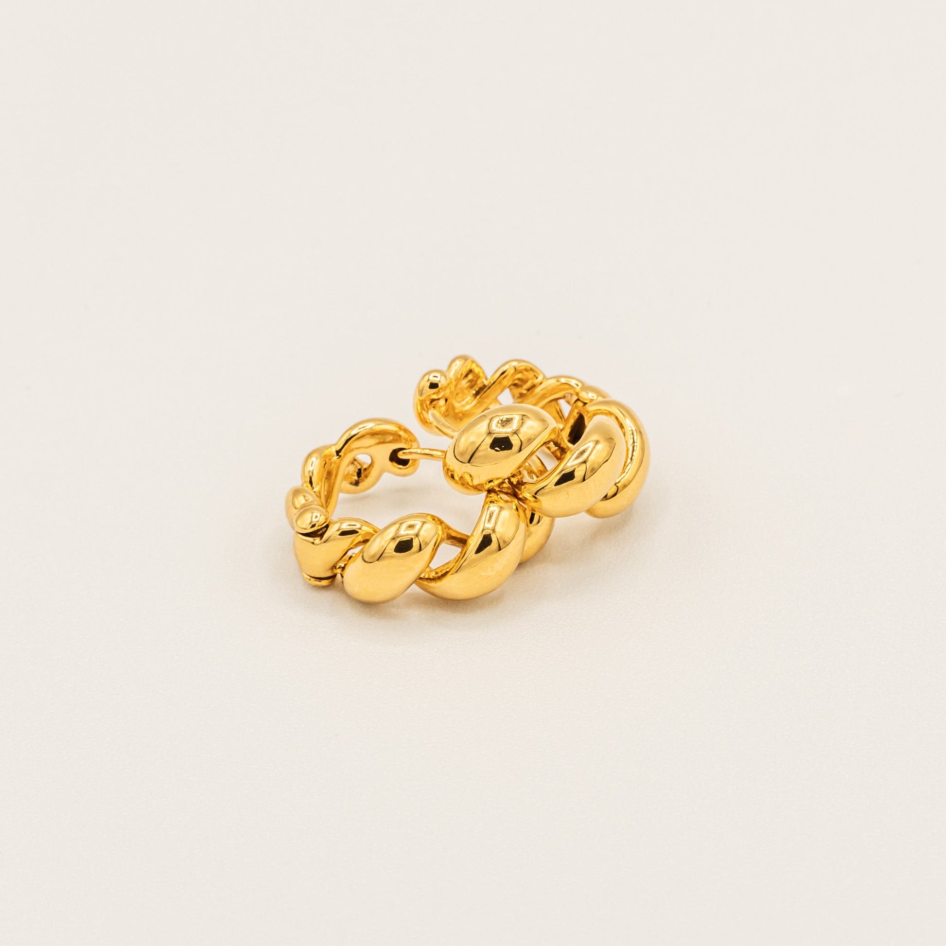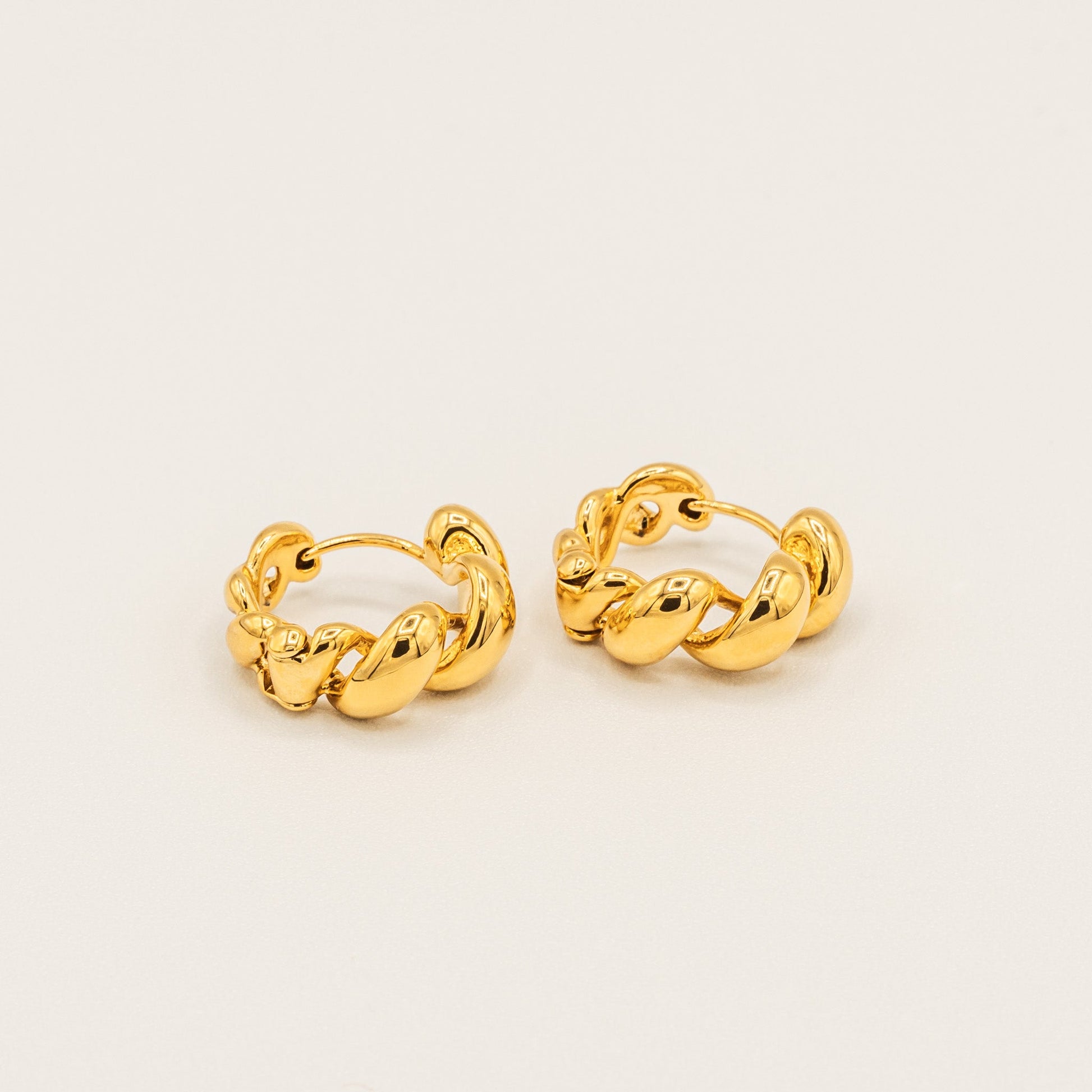 These luxuriously sculptural huggies feature a unique twisted rope design that creates a bold, dimensional effect. The polished curves catch and reflect light beautifully, making these earrings a striking addition to both casual and dressy ensembles.