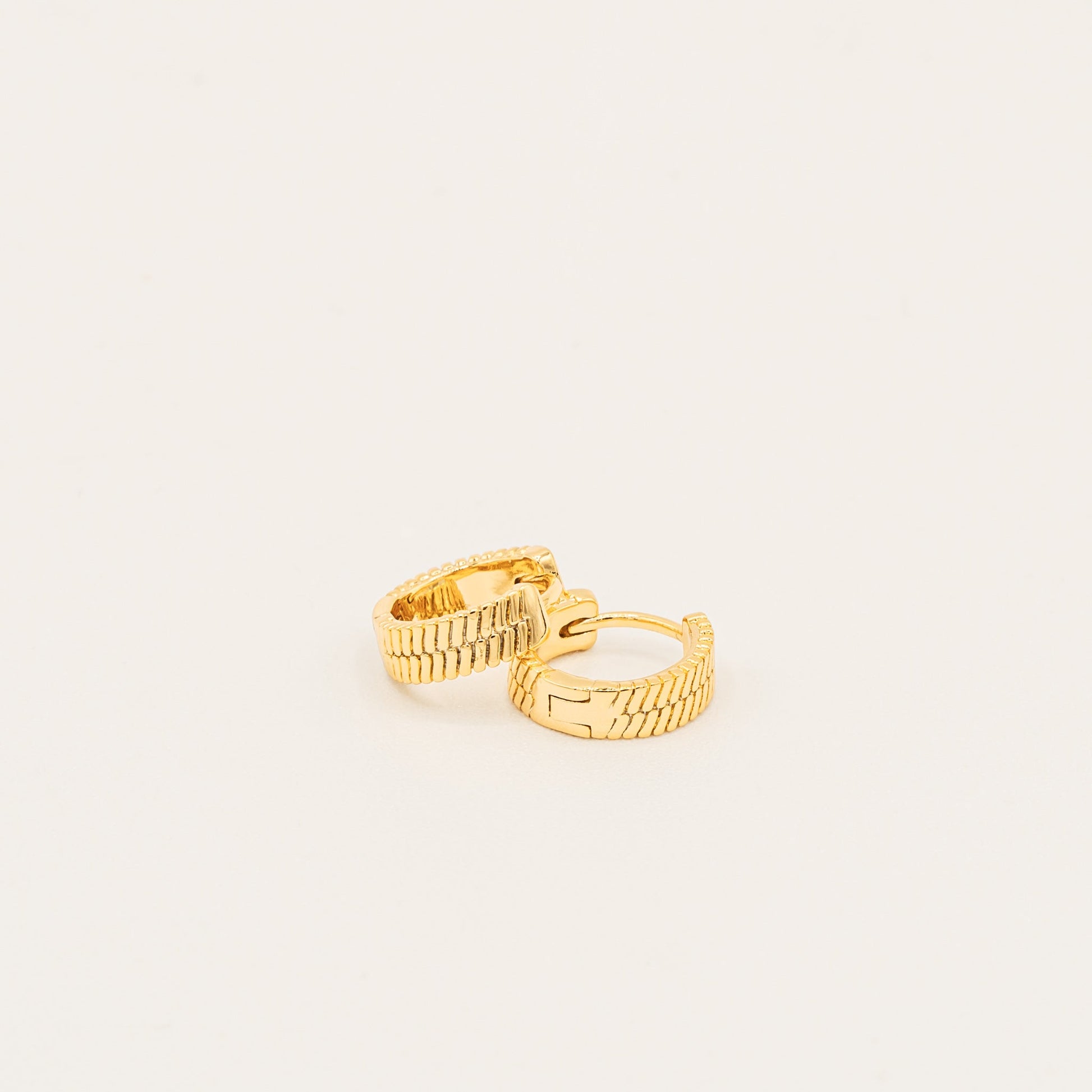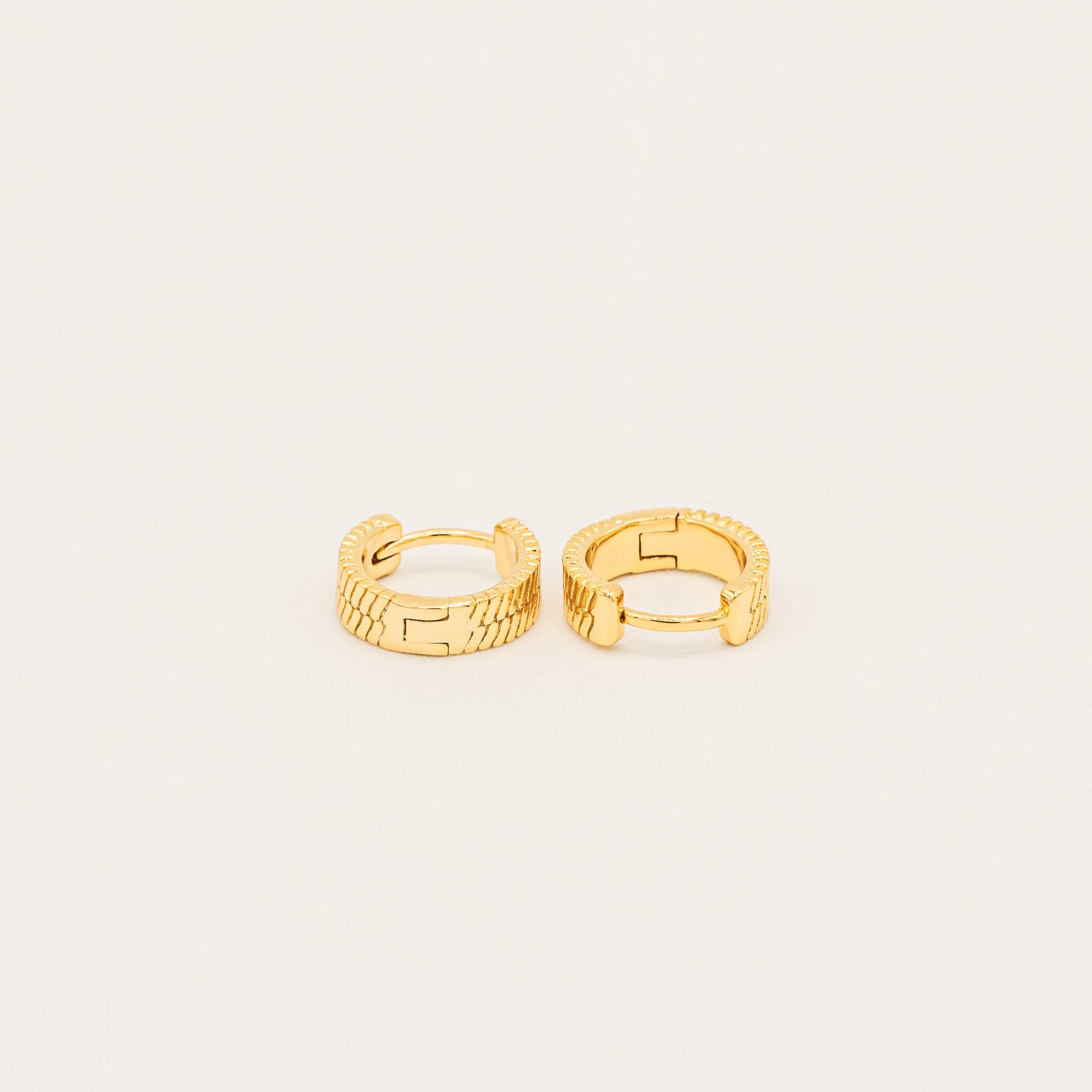 These striking huggie hoops showcase an intricate tire-tread pattern that adds an unexpected edge to a classic silhouette. The detailed texture catches light from every angle, creating a contemporary piece that makes a subtle yet distinctive statement.