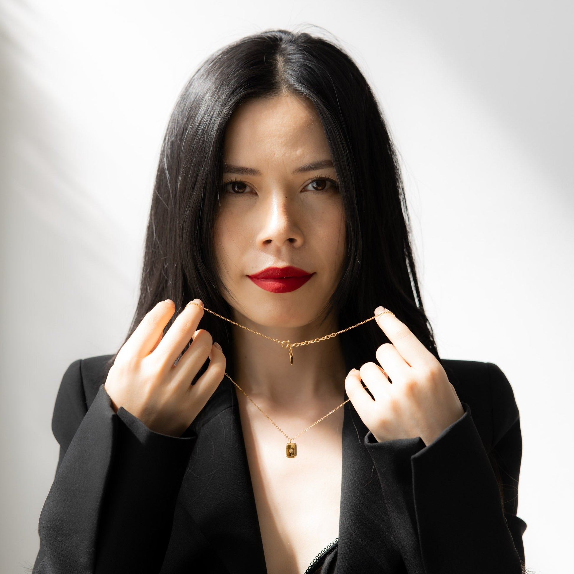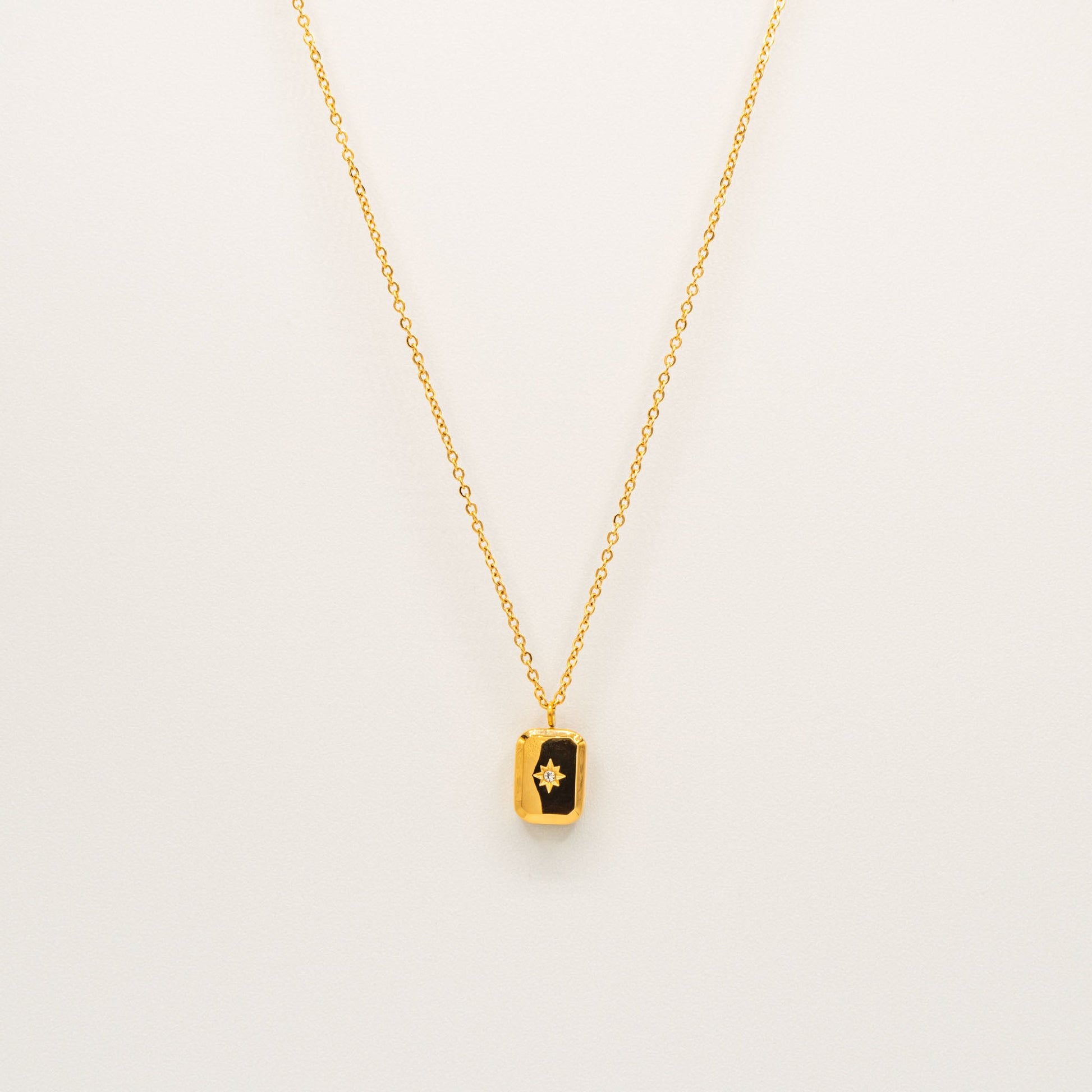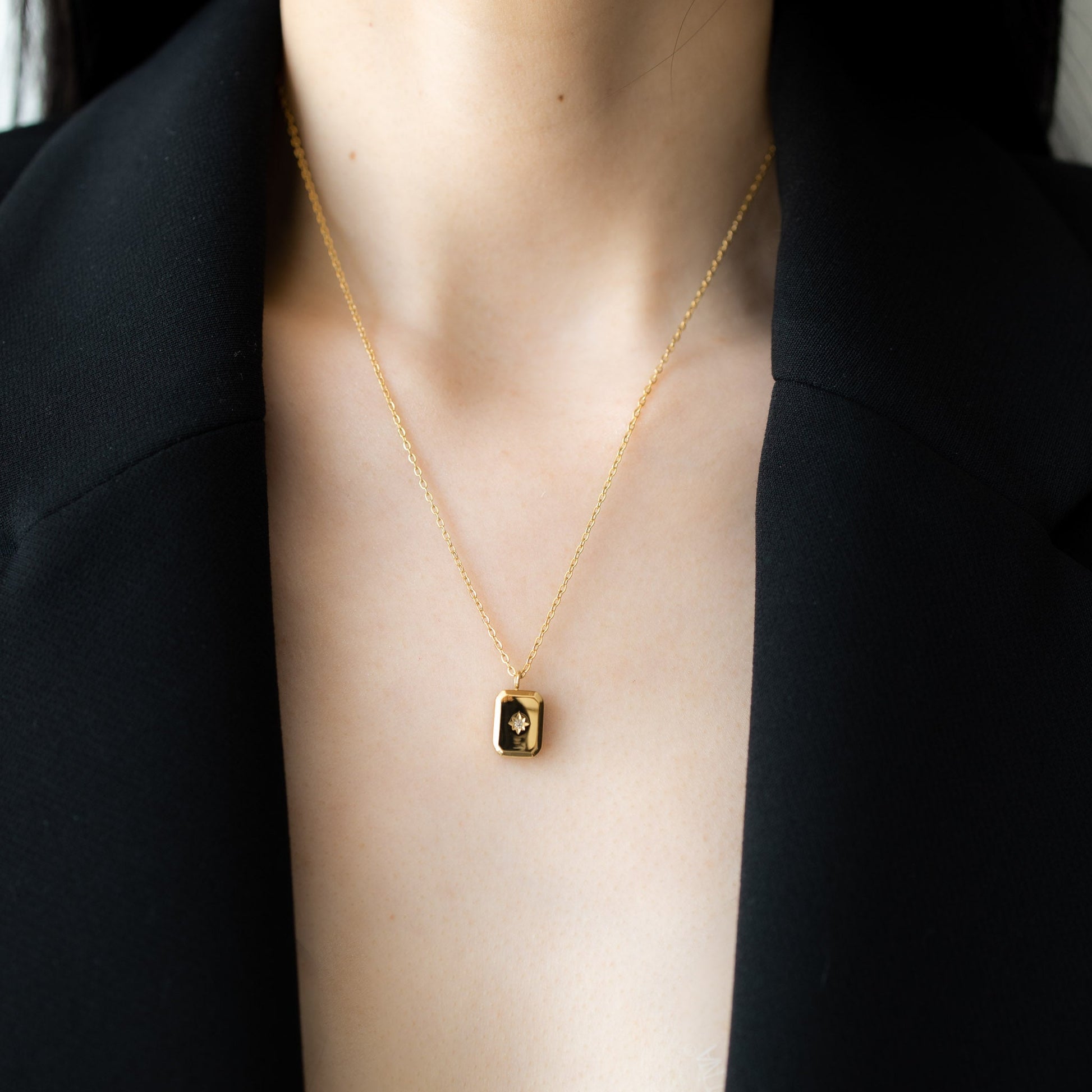Minimalist charm meets celestial inspiration. A sleek rectangular pendant with a subtle crystal star accent creates an understated yet meaningful piece.