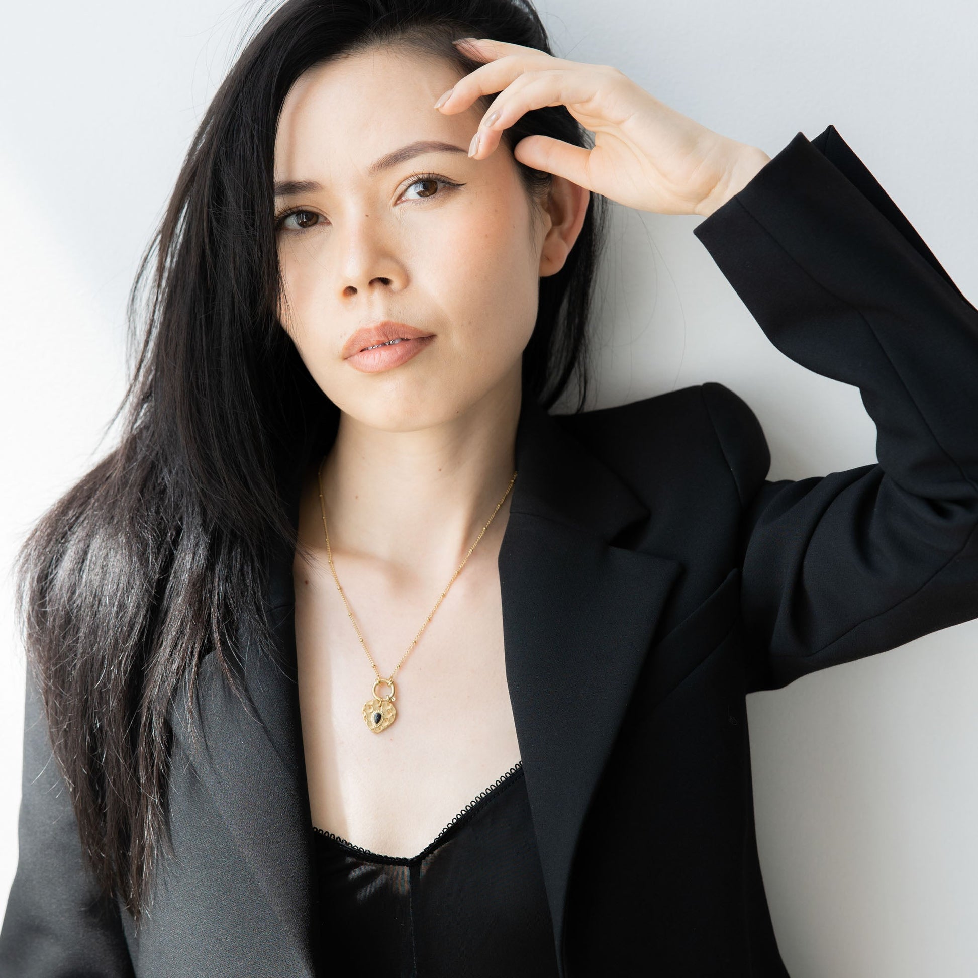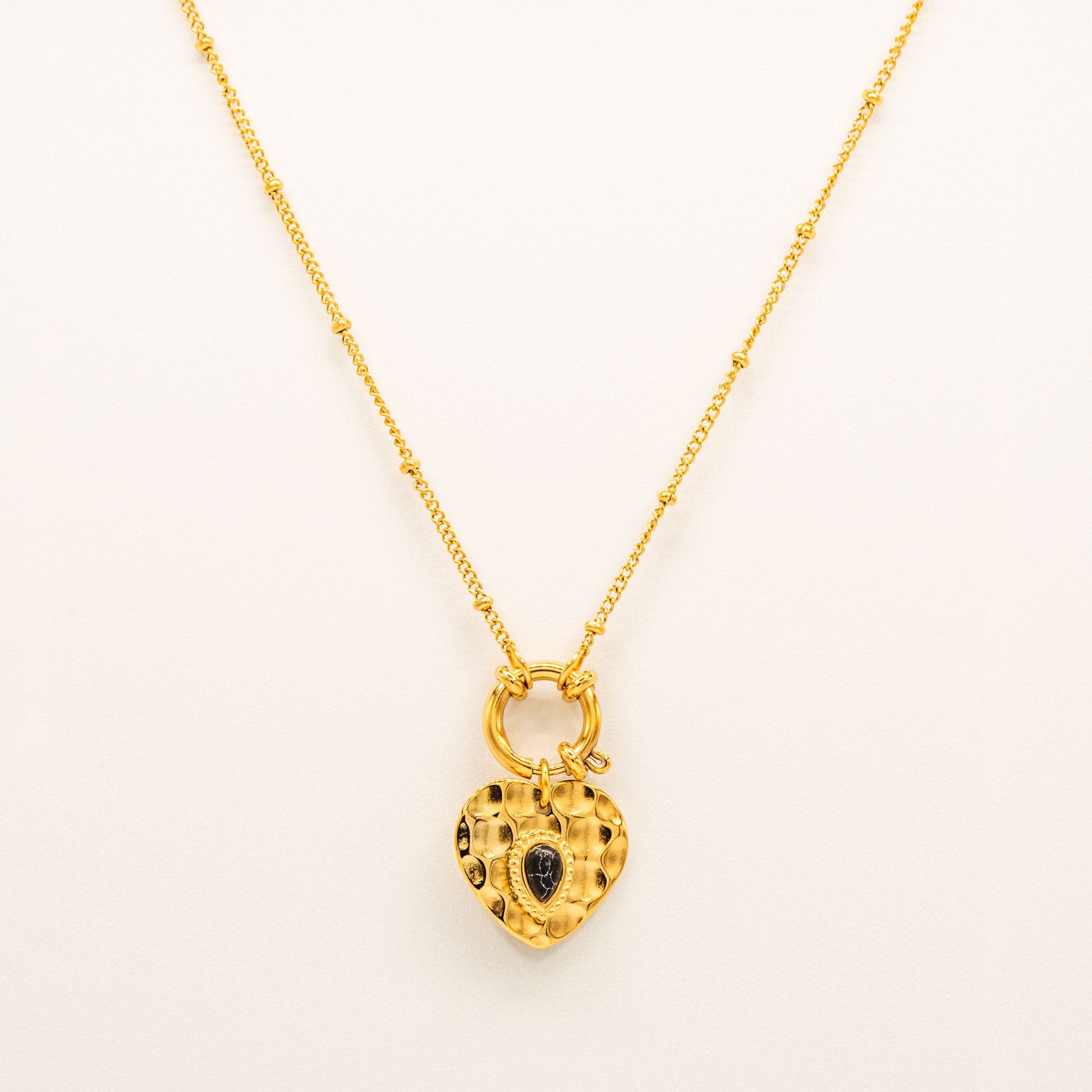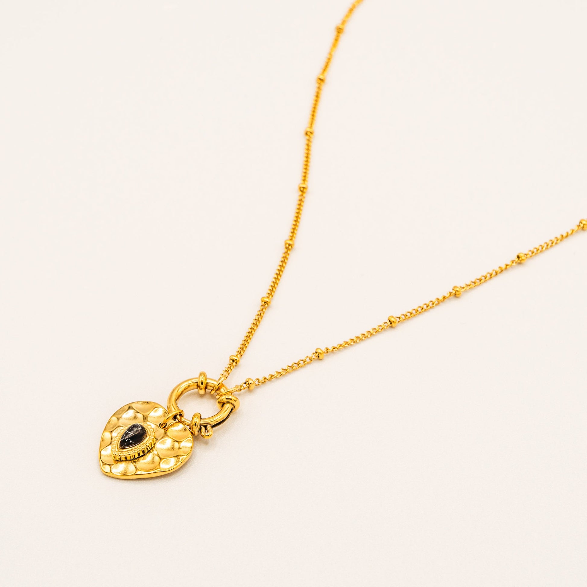 A romantic pendant with vintage charm. The heart-shaped locket features a quilted pattern and black crystal center, completed with a delicate toggle closure for added elegance.