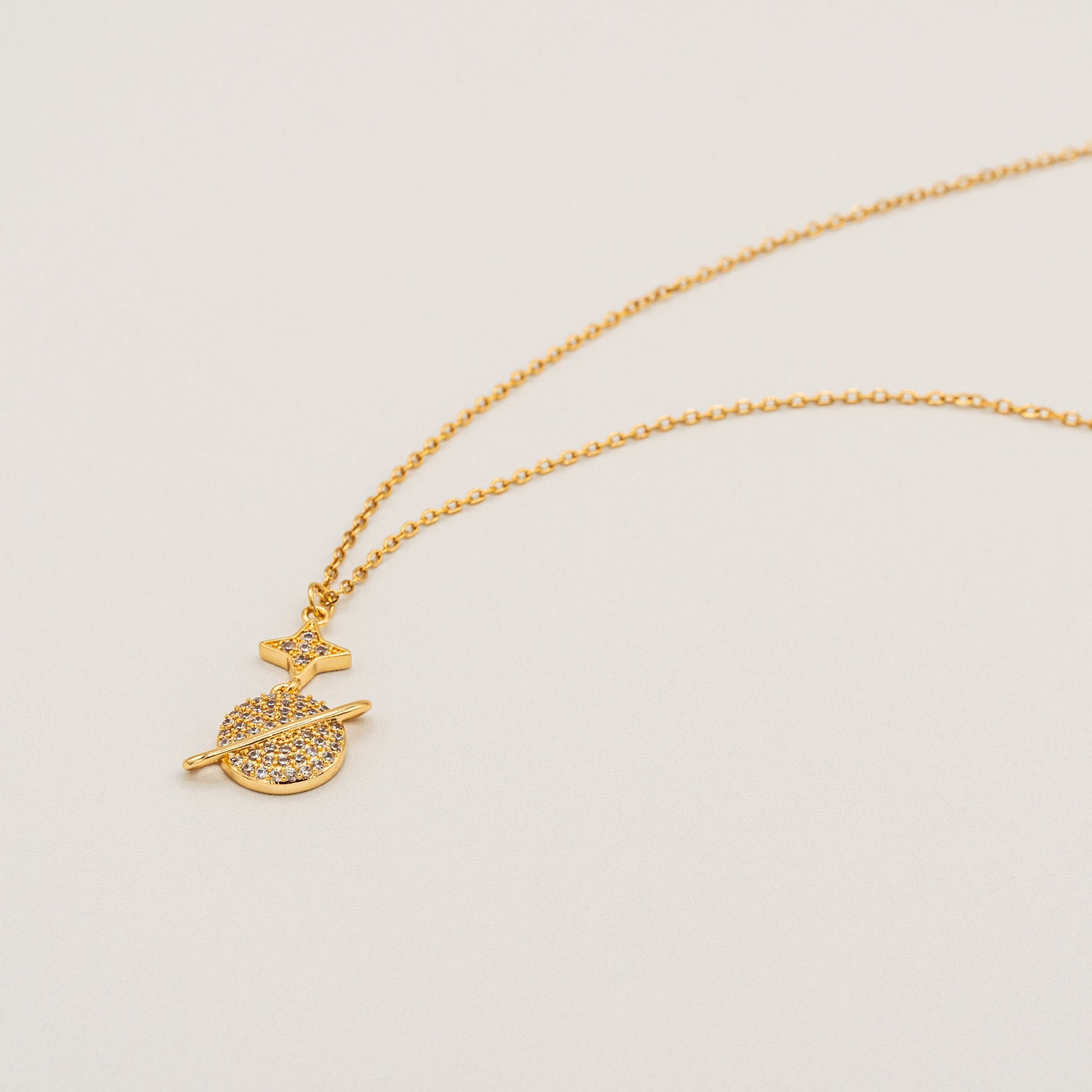 A celestial statement piece that captures cosmic beauty. The pendant combines geometric shapes with a cluster of delicate crystals, creating an elegant interpretation of planetary wonder.