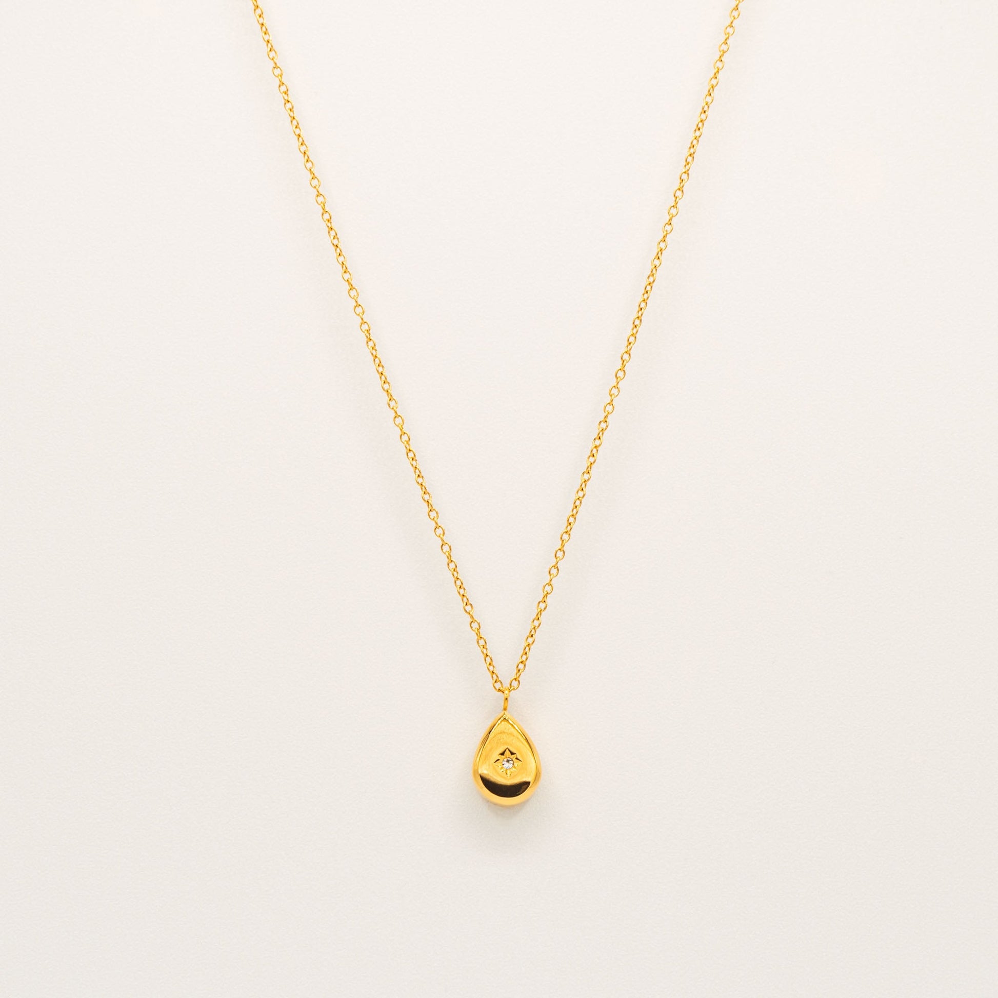 A minimalist pendant with a subtle shimmer. The smooth, teardrop-shaped charm features a delicate crystal accent, creating an effortless piece that transitions seamlessly from day to evening wear.